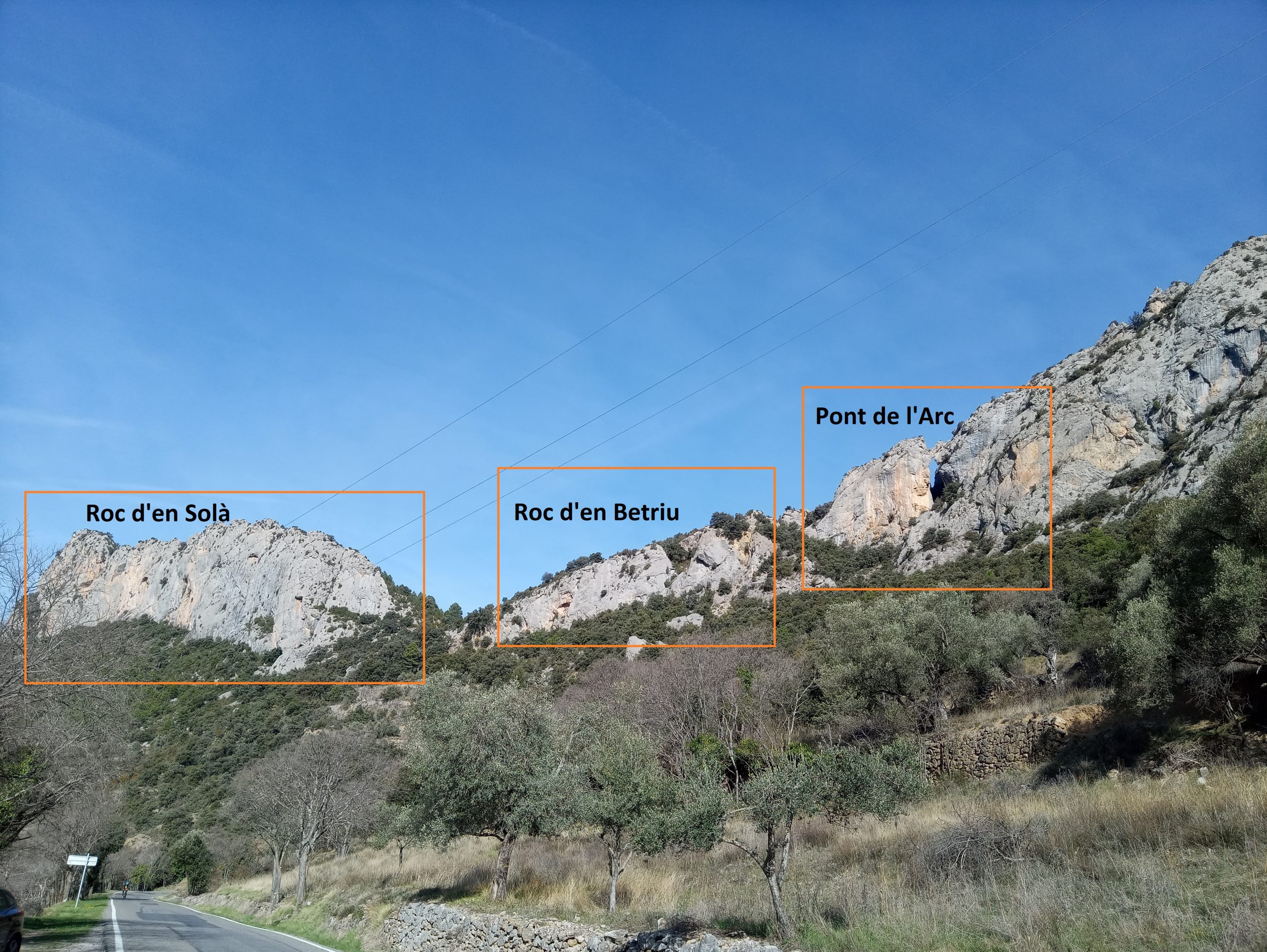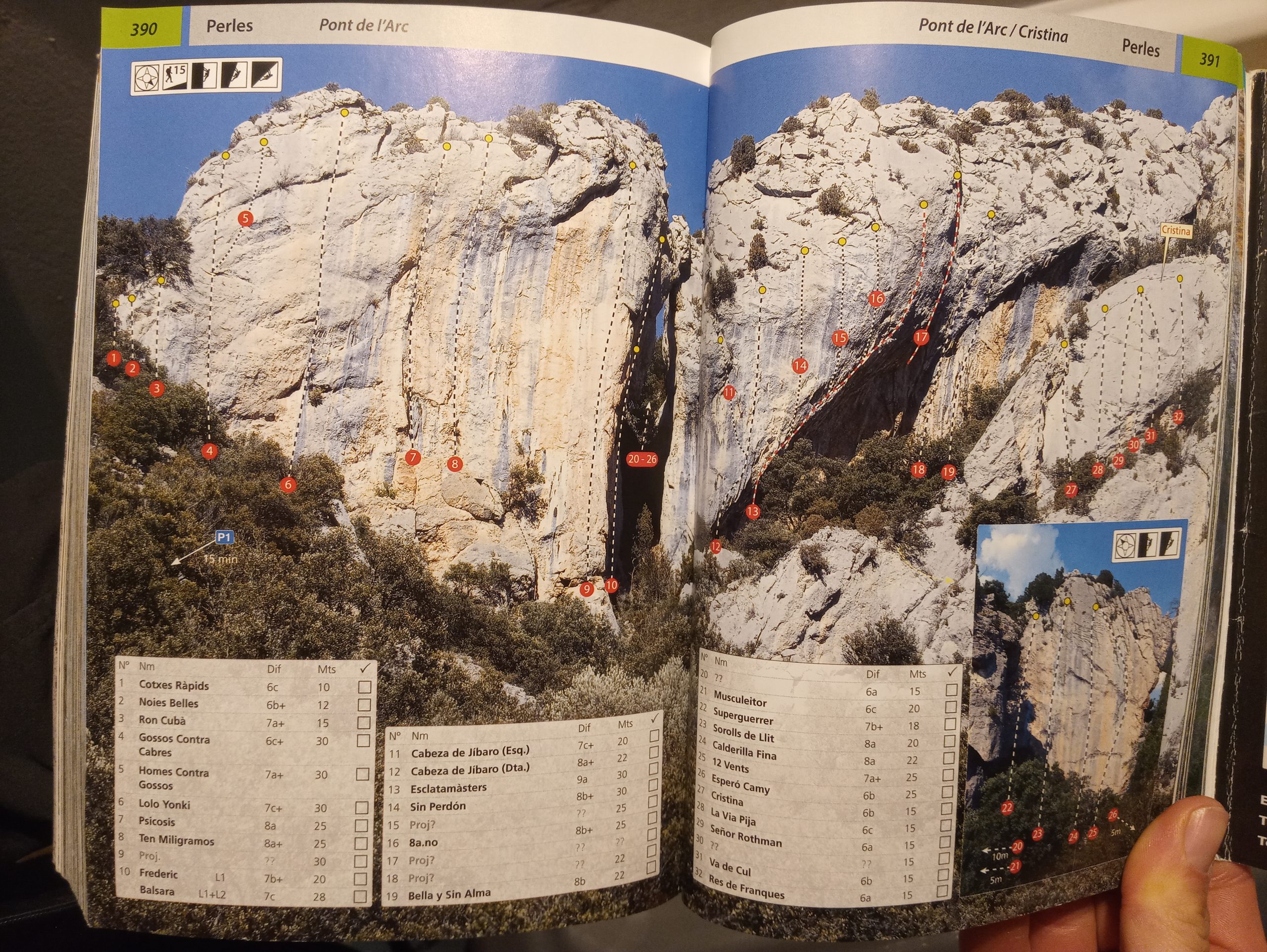 Perles offers climbing routes for all tastes, styles and grades. The sector Roc d’en Solà is a magnificient limestone wall offering technical and fingery lower grade (mainly 6s) face climbing. Roc d’en Betriu has a fine selection of 6s and 7s. The most impressive sector though is Pont de l’Arc which hosts one of the most stunning looking hard climbs in the region: the Esclatamásters (9a).