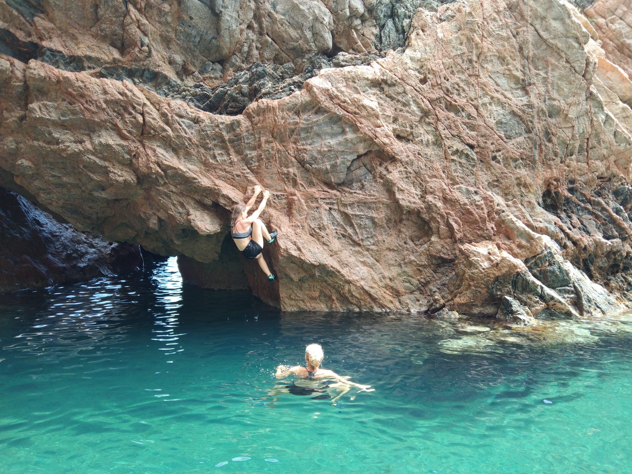 La bañera rusa (lit. trans. The Russian Bath) is a small cove in a stunning natural environment, surrounded by cliffs with spectacular views. It is located close to Cap Roig, in Calella de Palafrugell, just below the Botanical Garden. Next to it, a beautiful rock bridge over the deep clean waters which is a perfect spot for deep water solo.